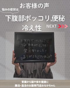 お腹の状態や症状に合わせた腸もみや超短波などのケアできることなどを提案させて頂きます。