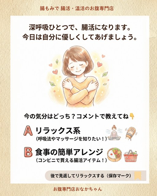 腸は、リラックスしている時(副交感神経が優位な時)にしか動きません。ストレスで固まったお腹を緩めるには、長く息を吐く「ため息」が最強のマッサージなのです。