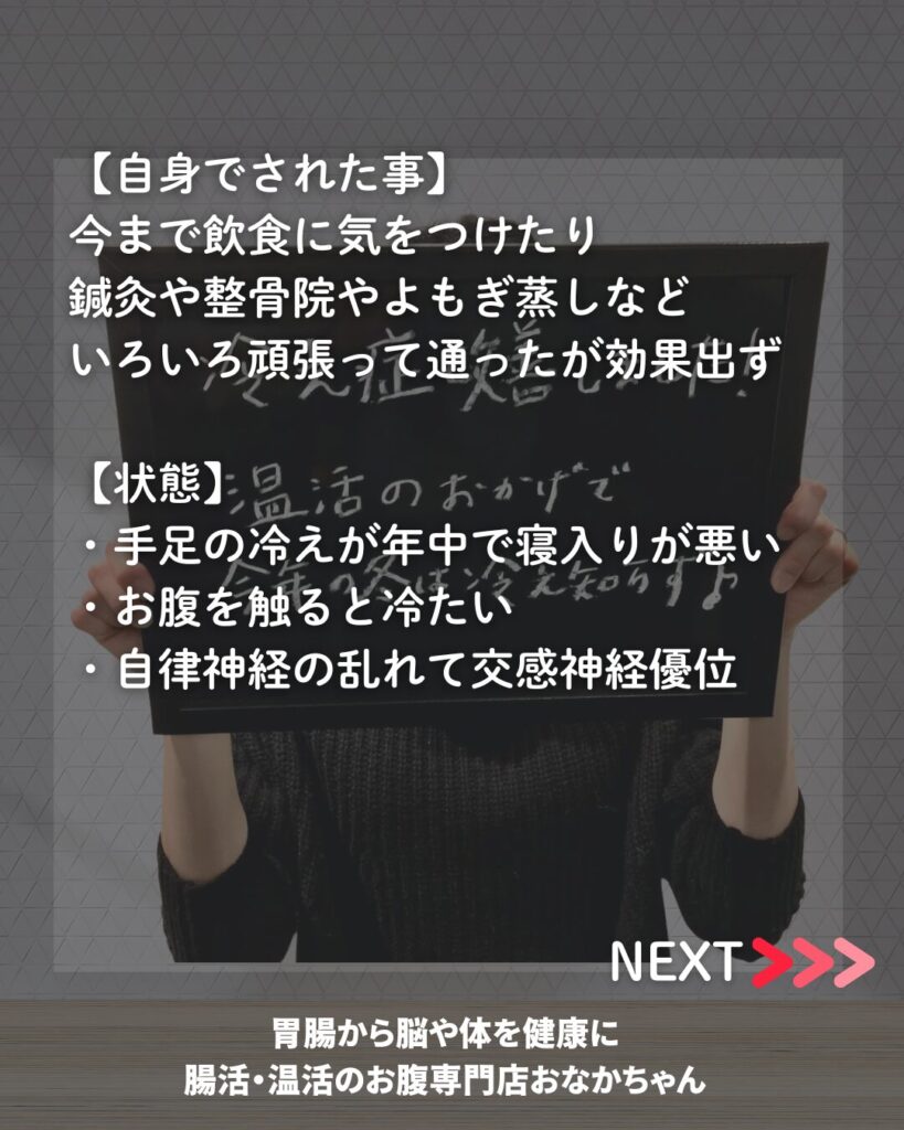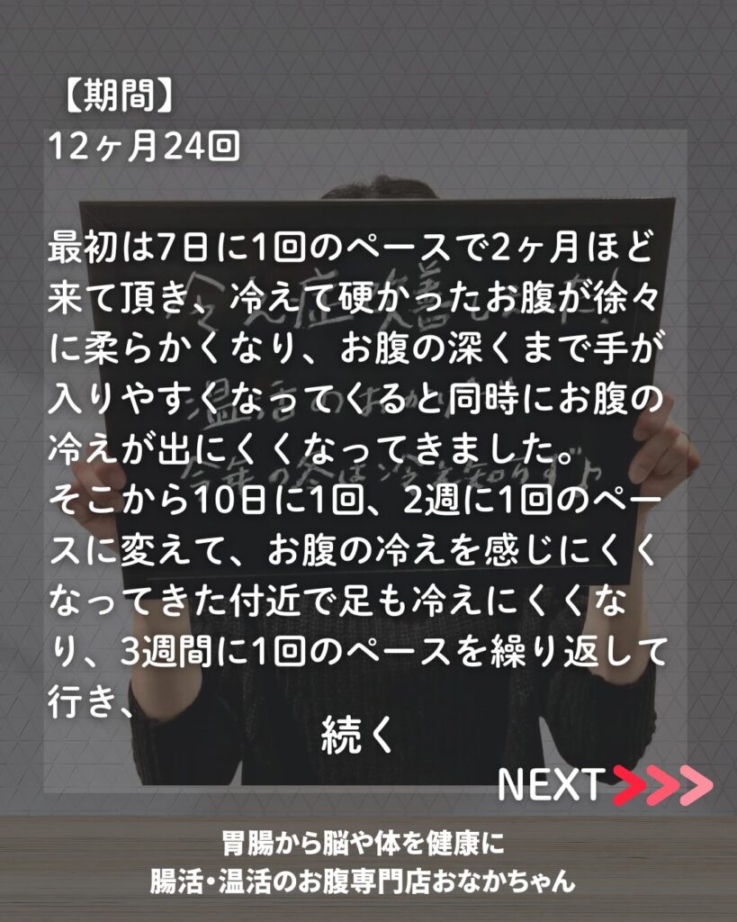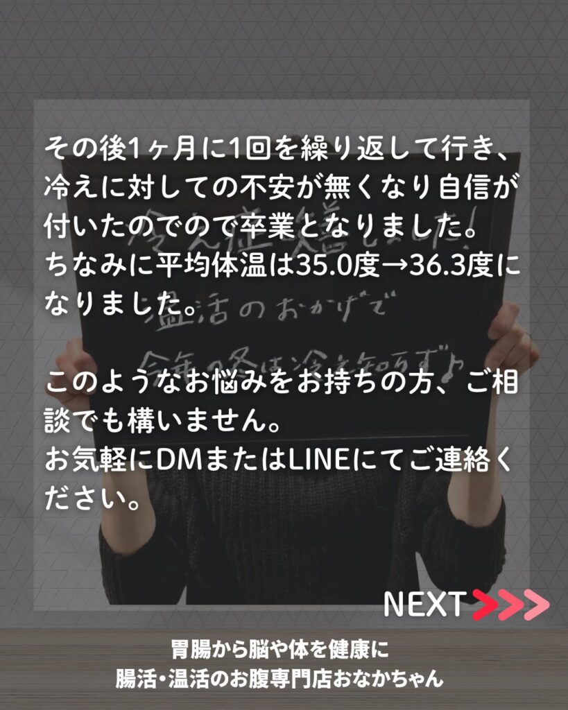 その後1ヶ月に1回を繰り返して行き、冷えに対しての不安が無くなり自信が付いたのでので卒業となりました。