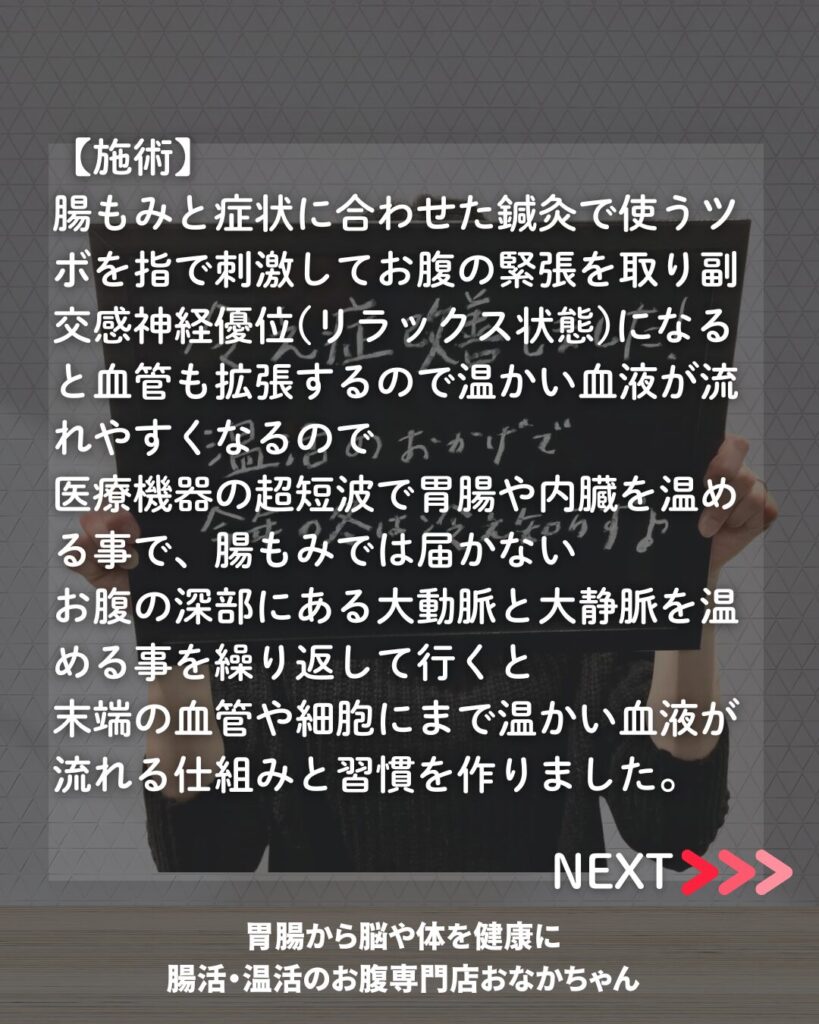 腸もみと症状に合わせた鍼灸で使うツボを指で刺激してお腹の緊張を取り副交感神経優位(リラックス状態)になると血管も拡張するので温かい血液が流れやすくなるので