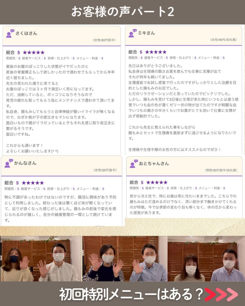 お腹の状態や症状に合わせた腸もみや超短波などのケアできることなどを提案させて頂きます。
