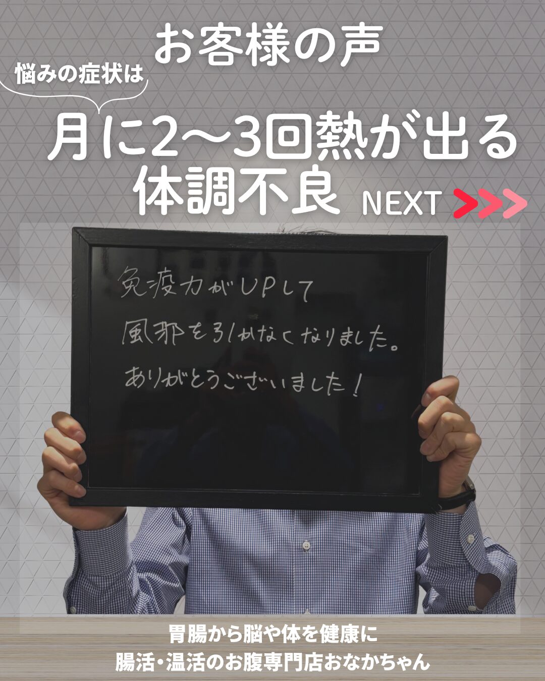 12ヶ月間の間に最初は10日に1回のペースで4ヶ月ほど来て頂き、発熱しにくくなり風邪も引きにくくなって来たので2週間、3週間に1回と言うペースで間隔を開けても大丈夫と言う自信をつけてもらう期間を繰り返し、最後は4週間経っても悩まれていた症状が出なかったため、卒業となりました。
