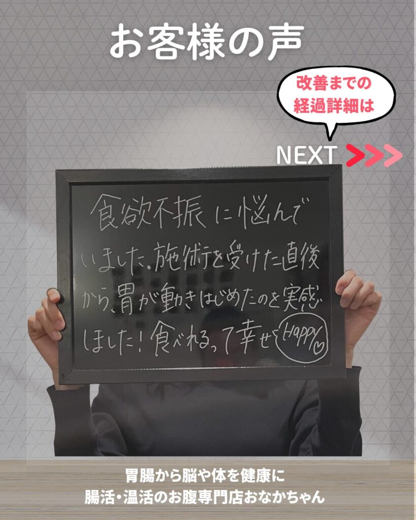 お腹の状態や症状に合わせた腸もみや超短波などのケアできることなどを提案させて頂きます。