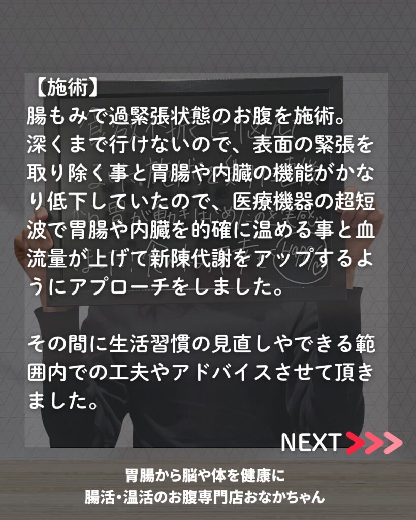 深くまで行けないので、表面の緊張を取り除く事と胃腸や内臓の機能がかなり低下していたので、医療機器の超短波で胃腸や内臓を的確に温める事と血流量が上げて新陳代謝をアップするようにアプローチをしました。