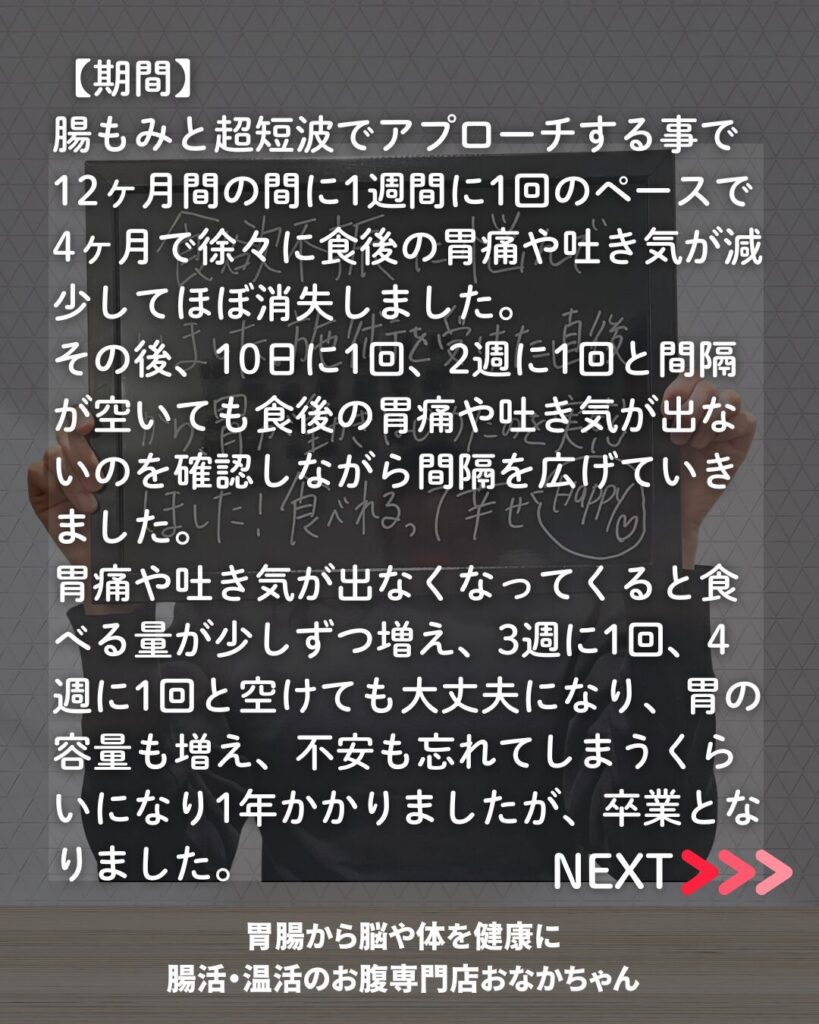 12ヶ月間の間に1週間に1回のペースで4ヶ月で徐々に食後の胃痛や吐き気が減少してほぼ消失しました。