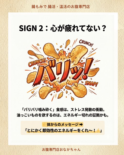 「バリッ!ボリッ!」と噛み砕くあの食感。そして油の満足感。 これらを求めている時は、ストレス過多でホルモンバランスが乱れている可能性があります。 噛み砕く行為は、攻撃的な感情(イライラ)を発散させる効果があると言われています。体は「即効性のあるエネルギー(油)」と「発散」を同時に求めているのです。
