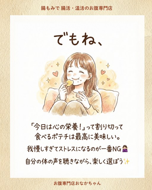 一番良くないのは、「食べちゃダメだ」と我慢してストレスを溜め込むこと。そして、食べた後に「また食べちゃった」と自分を責めること(これが最大のストレスになり、またポテチを欲するループに入ります)。