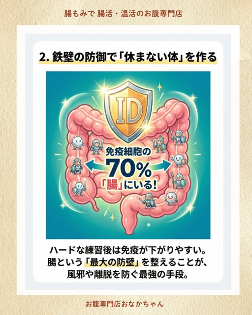 日頃から腸活で腸内細菌のバランスを整えておくことは、この免疫システムを正常に働かせ、風邪や感染症のリスクを最小限に抑えることにつながります。「休まない体」を作ることこそ、最強のトレーニングなのです。