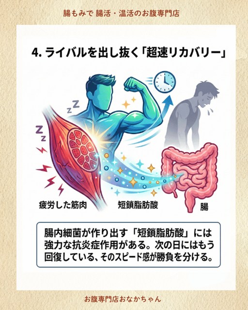 腸内環境が良好で、短鎖脂肪酸が体中を巡っていれば、運動によるダメージが速やかに修復され、疲労回復のスピードが格段に上がります。ライバルが疲労困憊している間に、あなたは涼しい顔で次のステップへ進めるのです。