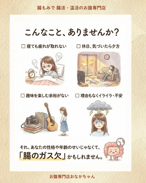 いかがでしたか? もし複数当てはまる場合、あなたの身体はエネルギー不足、いわば**「腸のガス欠」**状態に陥っているかもしれません。