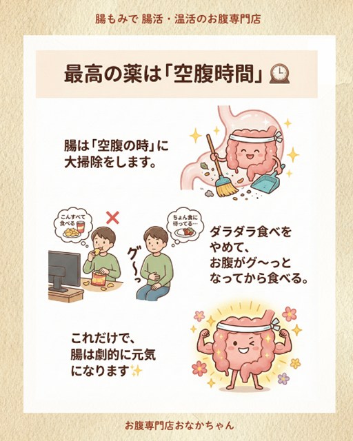 腸は、胃の中に何もない**「空腹の時」にだけ、強力な収縮運動(蠕動運動)を起こして、腸内の汚れや古い便を大掃除します**。