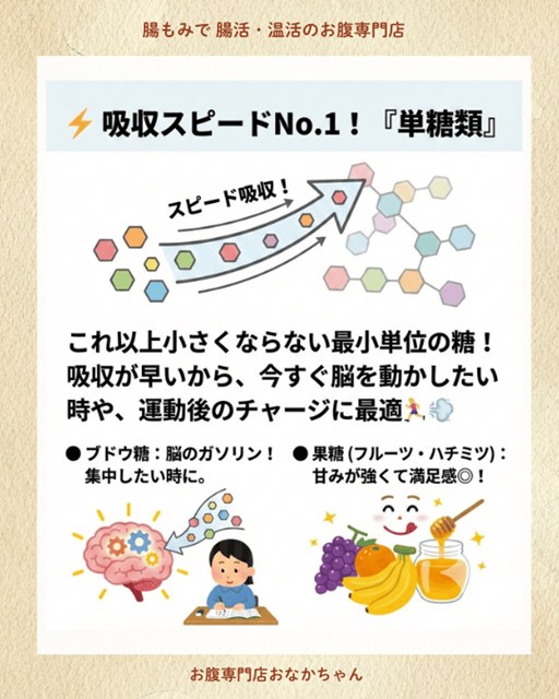 これ以上小さくならない、糖類の最小単位です。 分解する手間がないため吸収スピードが最も早く、すぐにエネルギーとして使われやすいのが特徴です。