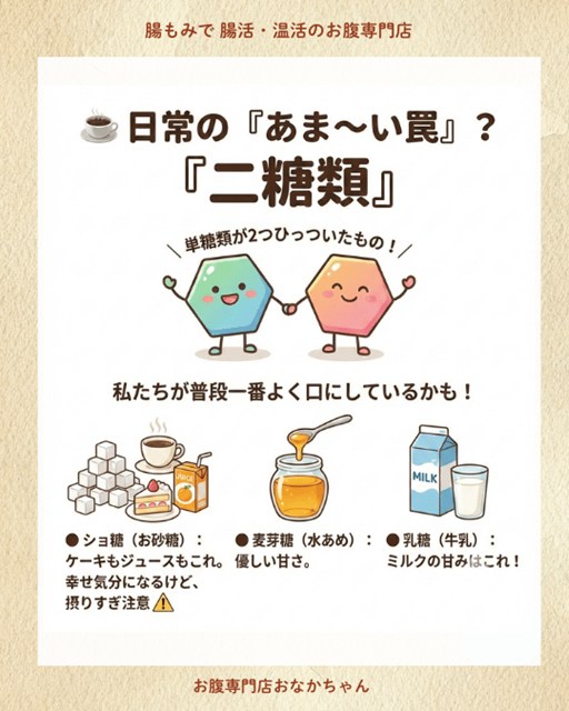 単糖類が2つひっついたもので、私たちが普段の生活で一番よく口にしている身近な糖です。