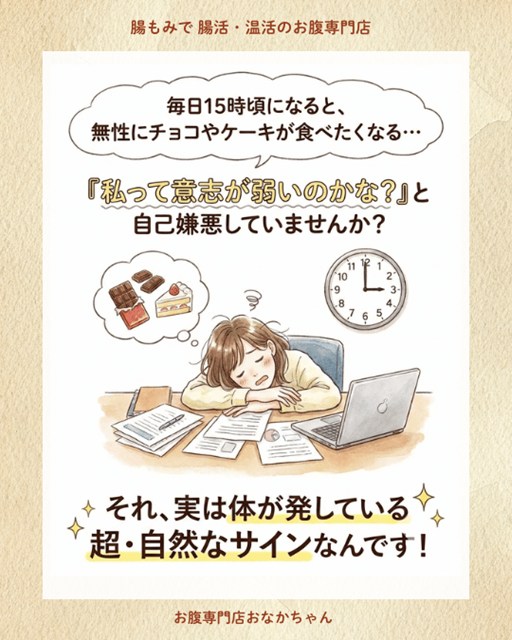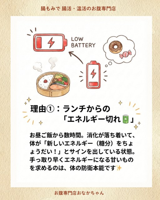 お昼ご飯を12時頃に食べた場合、消化が落ち着いてエネルギー(血糖値)が緩やかに下がり始めるのが、ちょうど15時前後です。 体は「エネルギーが足りなくなってきたから、一番手っ取り早く吸収できる糖分をちょうだい!」とサインを出します。これは体がガス欠を防ごうとする、立派な防衛本能なのです。