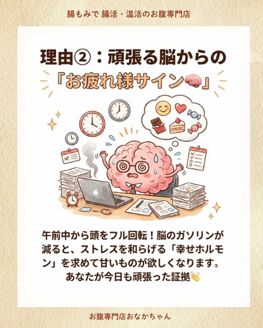 午前中からパソコン作業や家事で頭をフル回転させると、脳のエネルギー源が消費されます。また、集中による疲労やストレスを感じると、体はリラックスを促す「幸せホルモン(セロトニン)」を求めます。甘いものを食べるとホッとするのは、このためです。 つまり、15時のスイーツ欲は**「あなたが今日も一生懸命頑張っている証拠」**なんですよ。