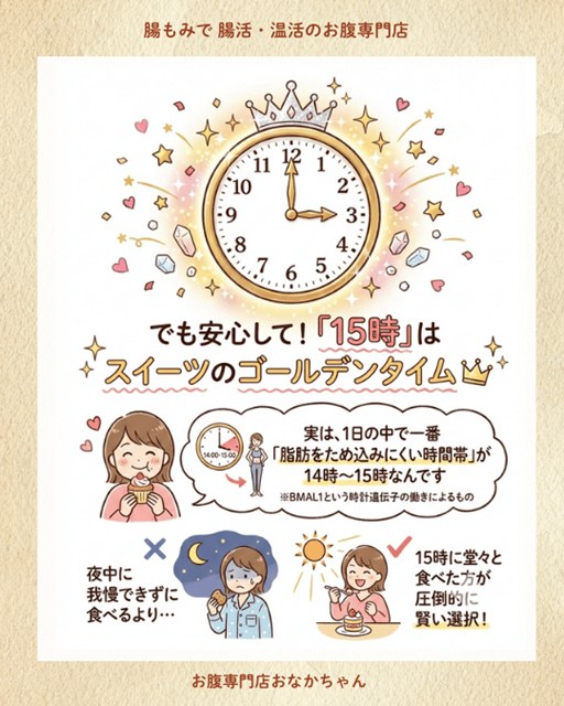 逆に、夜22時以降はこのBMAL1が急増します。つまり、夜中に我慢できずに甘いものを食べてしまうくらいなら、15時に堂々と食べた方が圧倒的に賢い選択というわけですね!