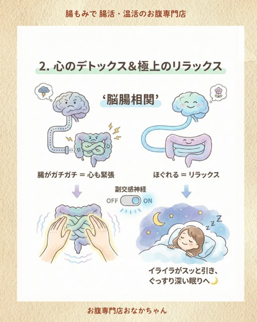 腸と脳は「脳腸相関」と呼ばれるほど密接に繋がっています。ストレスで腸がガチガチになると、心も緊張状態に。腸を優しくほぐすことで副交感神経のスイッチがONになり、理由のないイライラがスッと引き、ぐっすり深い眠りへと導かれます。