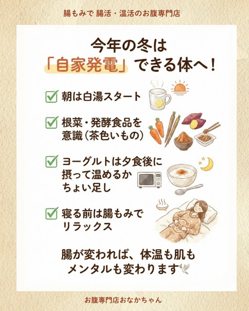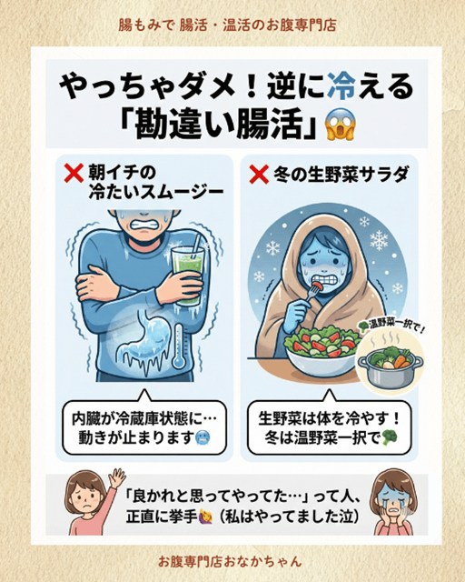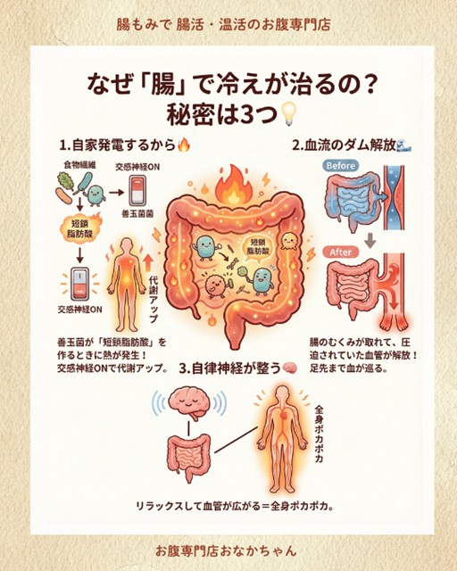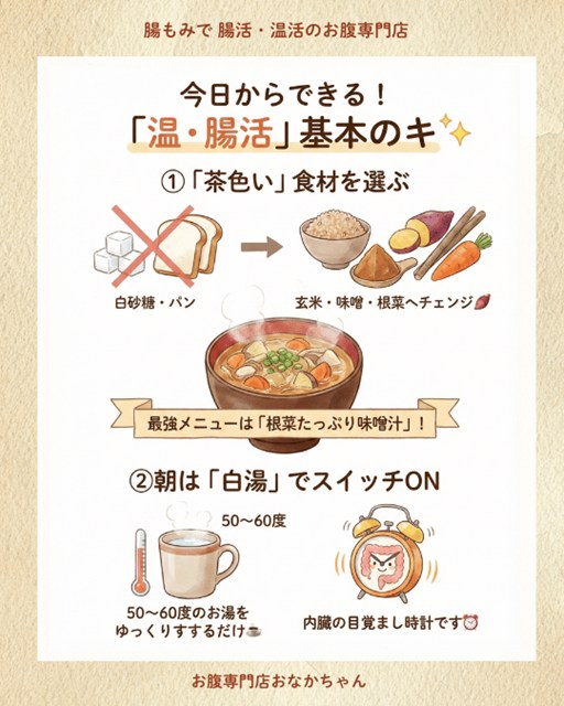冷えを改善する鉄則は**「腸を温めながら動かす」**ことです。