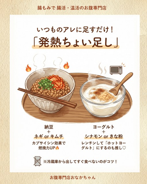 • 納豆 + ネギ、キムチ(カプサイシンで発熱効果)