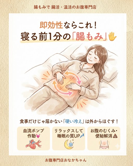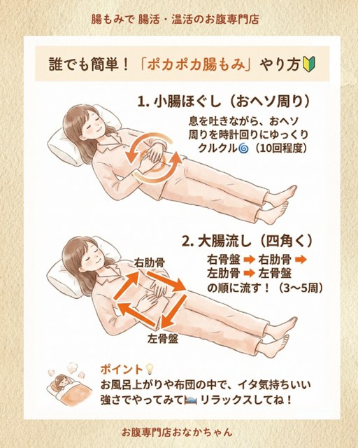 食事等のインナーケアに加え、外側から物理的に刺激する「腸もみ」を行うと、冷え改善のスピードは格段に上がります。お風呂上がりや寝る前のリラックスタイムに行いましょう。