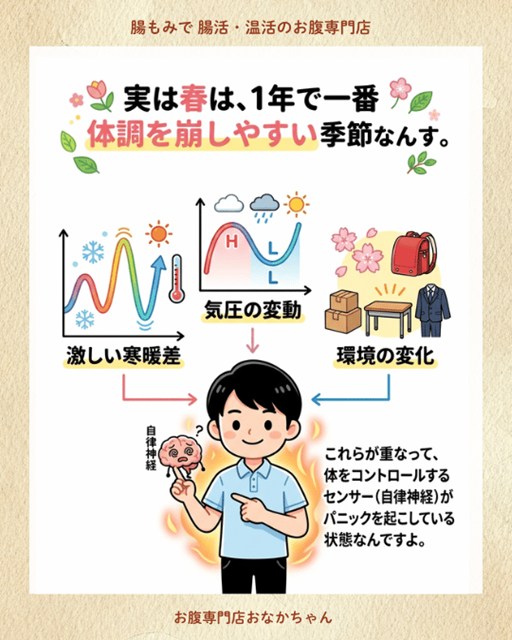 今回は、大阪で日々たくさんの方のお腹に触れている「おなかちゃん」が、春の不調の原因と、お家でできる簡単な腸活・温活ケアについてお伝えします!