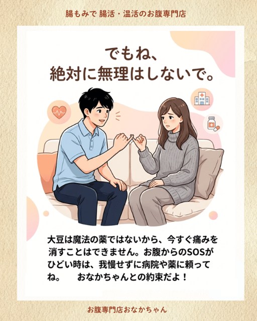 お薬で今の辛さを和らげながら、並行して日々の食事(大豆)や腸活(腸もみ)で、少しずつ「薬のいらない体づくり」を目指していく。それが一番安全で、心と体に優しい方法です。