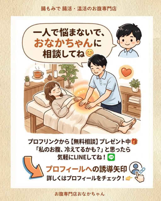 こんにちは!毎月のドーンと重いアレ、本当にお疲れ様です。 大阪で、腸もみによる腸活と温活をサポートするお腹専門店をしている「おなかちゃん」です。