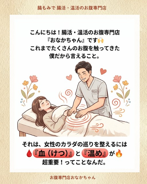 これまで、大阪のサロンでたくさんのお客様のお腹を触ってきた僕だから言えること。それは、女性のデリケートなカラダの巡りを整えるには、**「血(けつ)」と「温め」**が超重要!ということです。