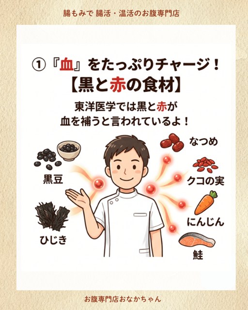 お腹周りを健やかに保つためには、栄養たっぷりの良質な「血」が不可欠です。東洋医学では、黒い食材や赤い食材が血を補ってくれる(補血:ほけつ)と考えられています。