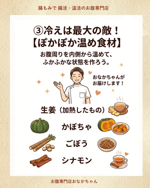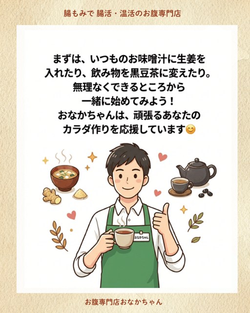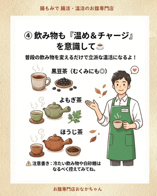 ⚠️ おなかちゃんからのワンポイントアドバイス 冷たい飲み物やアイス、白砂糖の摂りすぎはカラダを冷やす原因になりやすいです。なるべく温かいものを選び、常温以上の飲み物を心がけてみてくださいね。