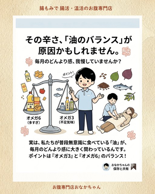 【大阪で腸活・腸もみ】毎月のドーンと重い悩みをフワッと軽くする「油のバランス」と温活ケア