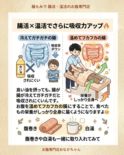 それは、**「どれだけ良い食材(油)を摂っても、腸が冷えてガチガチだと、しっかり吸収されない」**ということです。