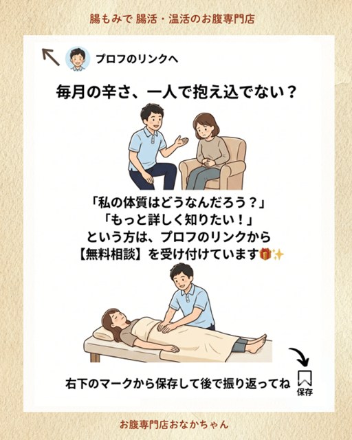 腸がほぐれると、自律神経のバランスも整いやすくなり、質の良い睡眠や、栄養の吸収力アップにも繋がります。毎月のどんより感だけでなく、冷えや便通のお悩み、肌荒れなどにも嬉しい変化を感じていただけるはずです。