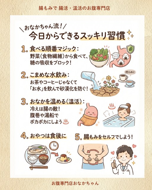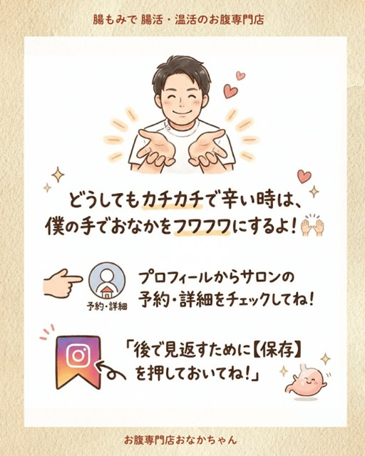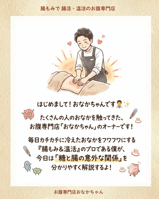 こんにちは!大阪・〇〇駅近くで、お腹専門店「〇〇」をしているオーナーの「おなかちゃん」です👨⚕️✨ 毎日、たくさんのお客様の冷えて硬くなったおなかを、フワフワにする『腸もみ&温活』のサポートをしています。