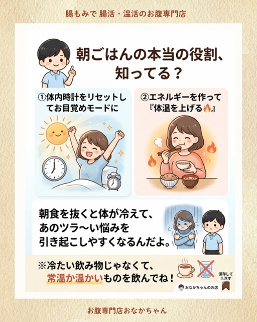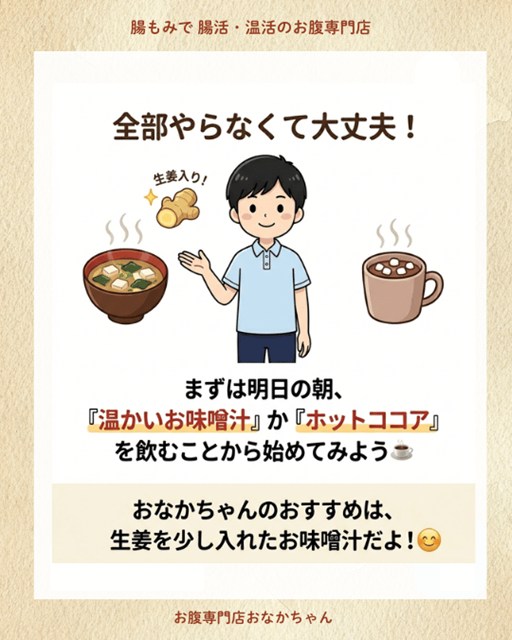 朝は冷たいスムージーや氷入りの飲み物ではなく、**「常温のお水」や「温かいお味噌汁」「ホットココア」**など、お腹を内側から温めるメニューを選ぶのがポイントです。