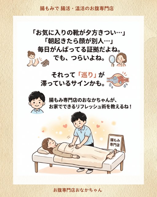 大阪 腸もみ専門店の「おなかちゃん」が、あなたの体質や生活習慣に寄り添って、内側からぽかぽか巡る体づくりをサポートします。お腹がフワフワに柔らかくなると、驚くほど足元もスッキリ軽くなるのを実感していただけるはずです。