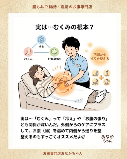 夕方になると体がパンパンになりやすい方の多くは、**「お腹(腸)が冷えて硬くなっている」**ことが多いんです。 お腹には全身の巡りの中心となる太い血管やリンパが集中しています。ここが冷えたりカチカチに張っていたりすると、いくら足元をマッサージしても、肝心の「通り道」が渋滞していてスッキリ流れてくれません。