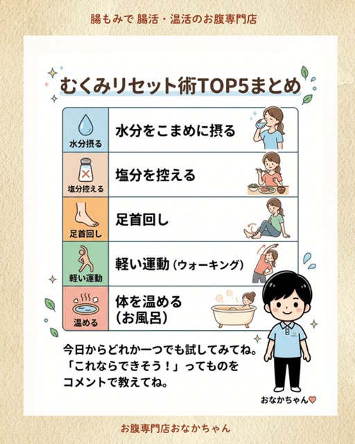 いかがでしたか?今日ご紹介したTOP5のケア、全部をいっぺんにやらなくて大丈夫です。「今日は時間があるからゆっくりお風呂に入ろう」「デスクワーク中に足首だけ回してみよう」と、あなたのペースで生活に取り入れてみてくださいね。