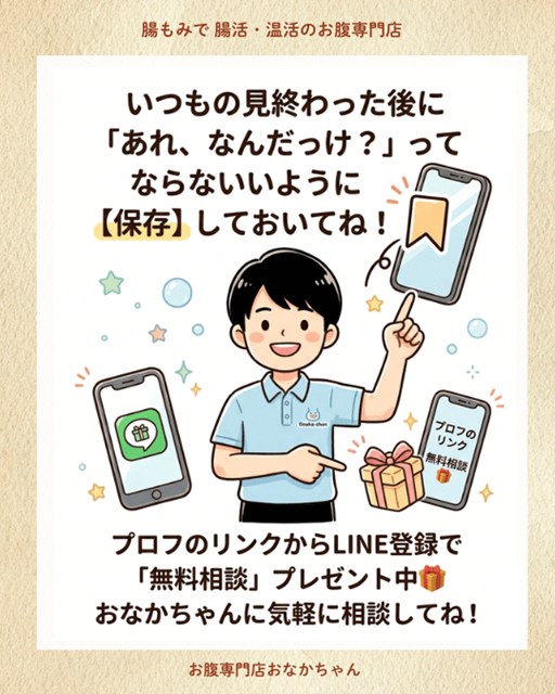 どんな小さなことでも大丈夫です。LINEから「無料相談希望」とメッセージを送ってくださいね。大阪 腸もみ・温活専門の「おなかちゃん」が、優しいお兄さんのようにあなたのお悩みにしっかりお答えします。