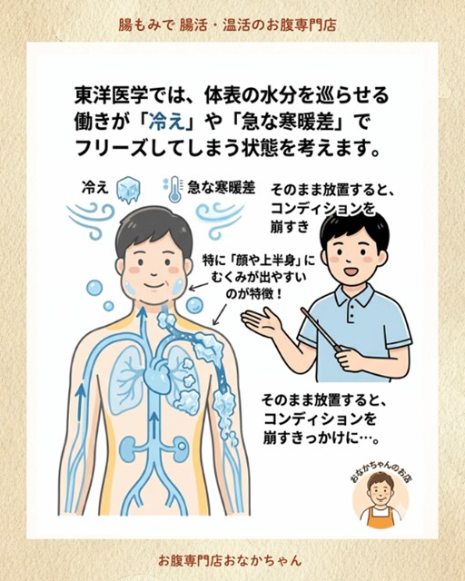 顔や上半身に集中して起こるむくみや、なんとなく感じる寒気。 東洋医学の考え方では、これを「体表の水分を巡らせる働きがフリーズしてしまっている状態」と捉えることがあります。