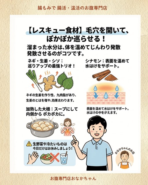 では、具体的にどうすればいいのでしょうか? まずは、毎日の「お食事(腸活)」からアプローチしていきましょう。溜まった水分は、温性の食材でじんわり発散させるのがコツです。