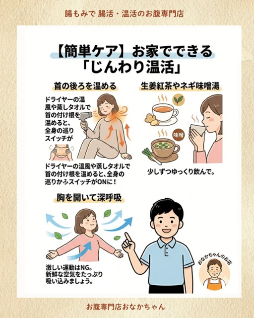 だからこそ、**大阪の腸もみ専門店「おなかちゃんのお店」**では、ただお腹を揉むだけでなく、「温めること(温活)」をとても大切にしています。 腸を優しくほぐして本来の柔らかさを取り戻し、内側からポカポカと温かい状態を作ってあげることで、全身の巡りがスムーズになり、ちょっとやそっとの寒暖差では揺らがないコンディション作りを目指せます。