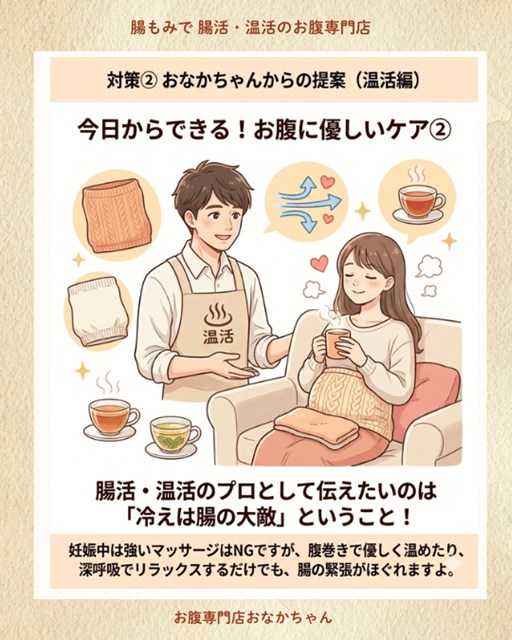 大阪で腸もみを専門に行う僕が強くお伝えしたいのは、「冷えは腸の働きを下げてしまう」ということ。 妊娠中のセルフマッサージ(お腹を強く揉むこと)はNGですが、腹巻きで優しくお腹周りを温めたり、温かい飲み物を飲んで深呼吸したりするだけでも、腸の緊張がほぐれてリラックスできますよ。
