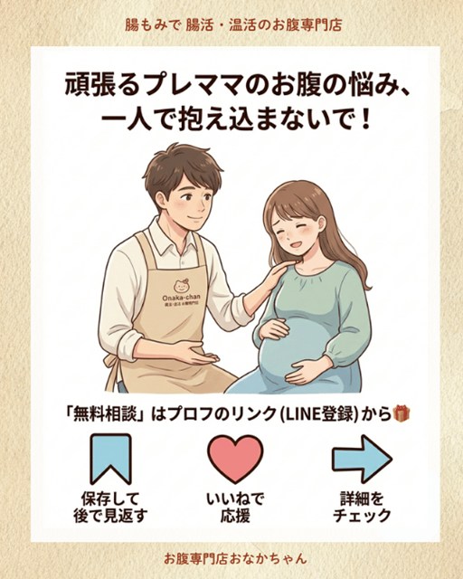 もしあなたが大阪で腸活や温活のサポートをお探しなら、ぜひ「おなかちゃん」にご相談ください。 ※妊娠中の方へは、直接的な強い「腸もみ」ではなく、ご自宅でできる安全な温活アドバイスや食事指導を中心としたマタニティ向けの腸活サポートをご提案しています。産後の本格的な「大阪 腸もみ」デビューに向けての準備としても大変ご好評いただいています!