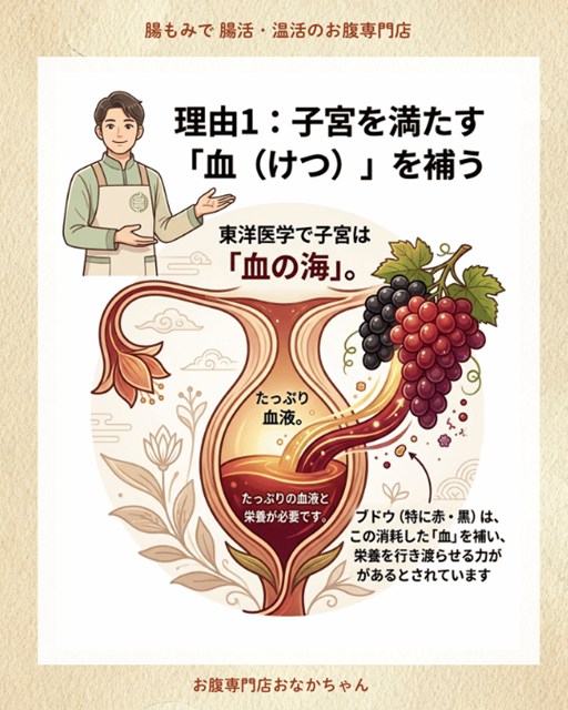 東洋医学において、子宮は**「血の海」**と呼ばれるほど、たっぷりの血液と栄養を必要とする場所です。ブドウには、消耗した「血」を補い、全身へ栄養を行き渡らせる(補血:ほけつ)働きがあるとされています。