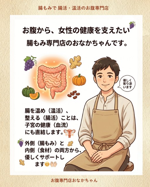 腸と子宮は、お腹の中で隣り合っています。 **「大阪 腸活」「腸もみ 大阪」**などで検索しておなかちゃんのお店に来てくださる方の多くが、腸へのアプローチを通じて「お腹全体が温かくなった」「巡りが良くなった気がする」と感じていらっしゃいます。