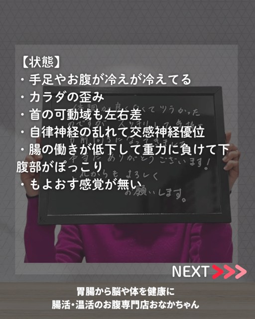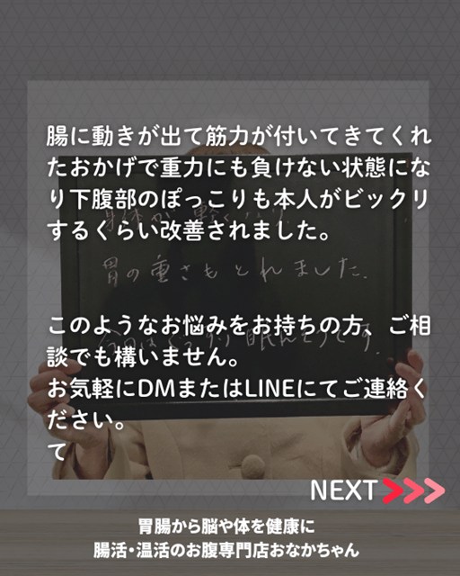 • 現在: 腸の働きが活発になり、お腹周りを支える力もついてきました。重力に負けない状態になり、ご本人も驚くほど下腹部のぽっこりがスッキリ!お通じのサイクルも安定してきました。