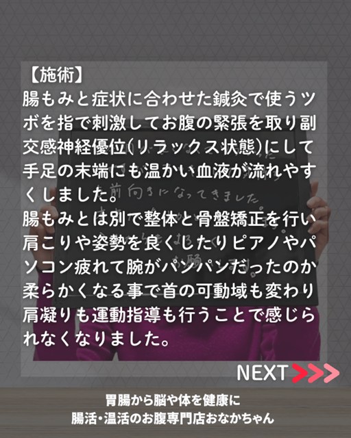 2. 整体と骨盤矯正で姿勢を整える 腸もみとは別に、整体と骨盤矯正をプラス。パソコンやピアノでパンパンになっていた腕を緩め、肩や首の動きをスムーズに。姿勢が良くなることで、お腹にかかる負担も軽減します。