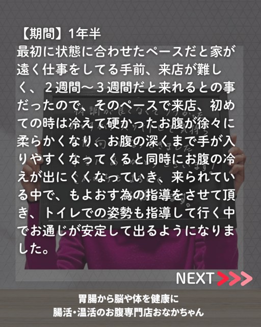 • 中期: お腹の冷えを感じにくくなり、巡りの良さを実感。並行して、トイレでの座り方など、日常生活でのアドバイス(運動指導)も実践していただきました。