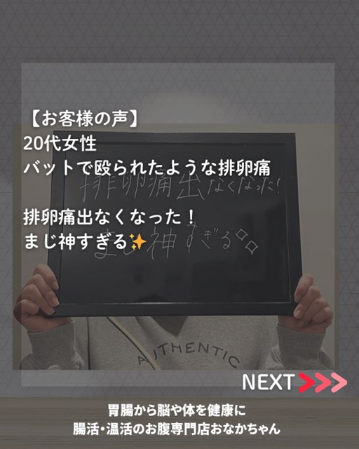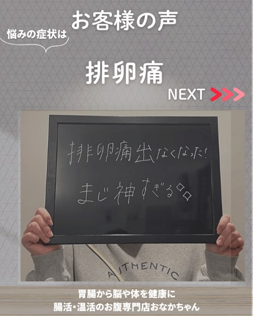 現在では、あの「バッドで殴られたような痛み」もなくなり、排卵痛を全く気にせずに快適な日常生活を送れるまでになられています。
